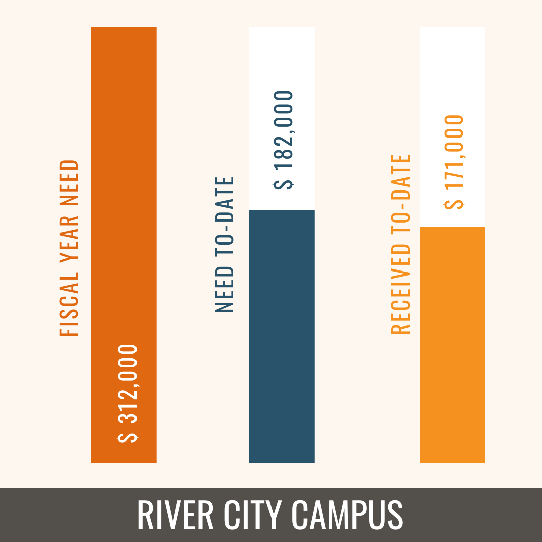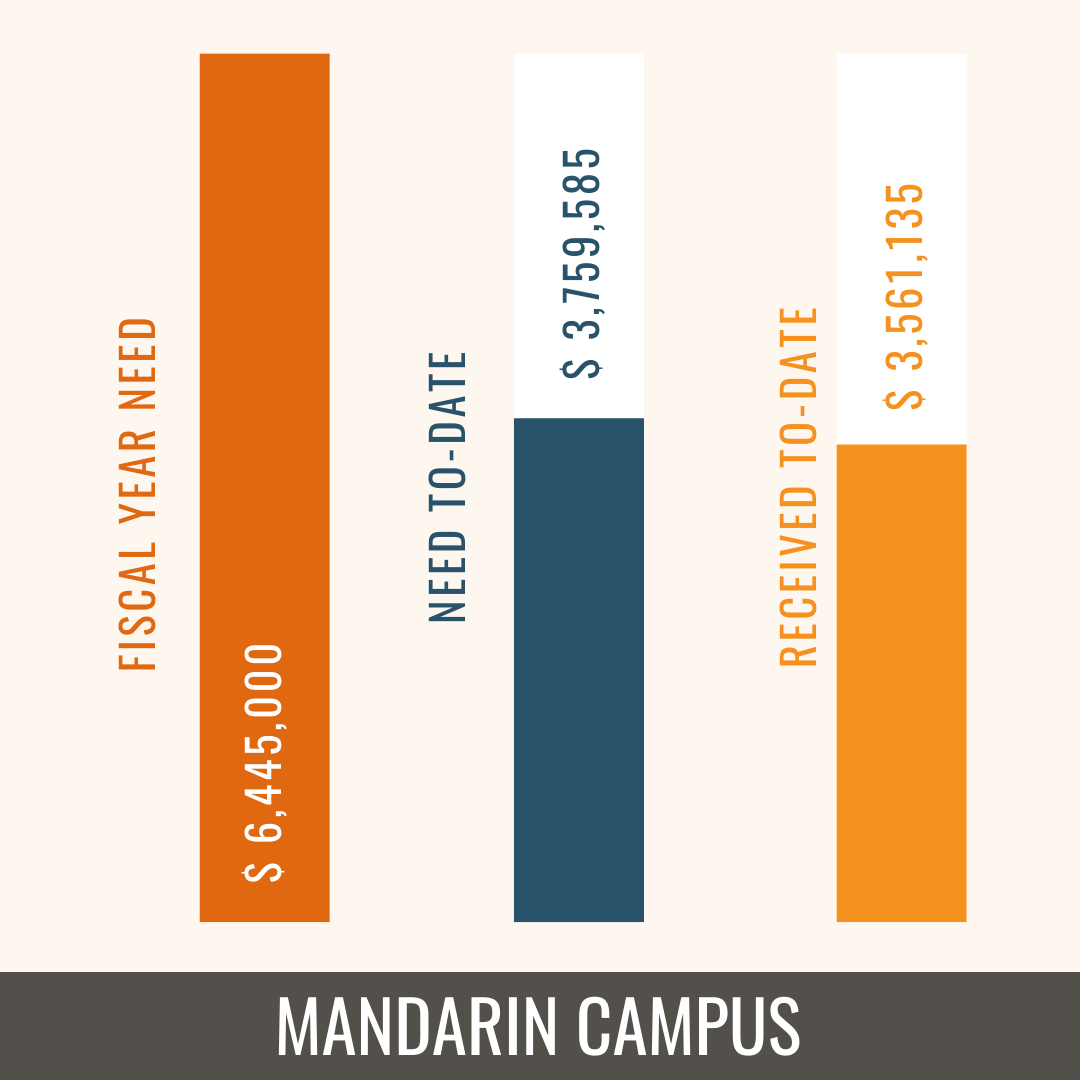 The dollar amounts in the graphs below reflect the fiscal year need for each campus, the need to date, and the actual amount received to date for the fiscal budget year of 8/1/2025 – 07/31/2026. These numbers are updated monthly and are current through 03/01/2026.